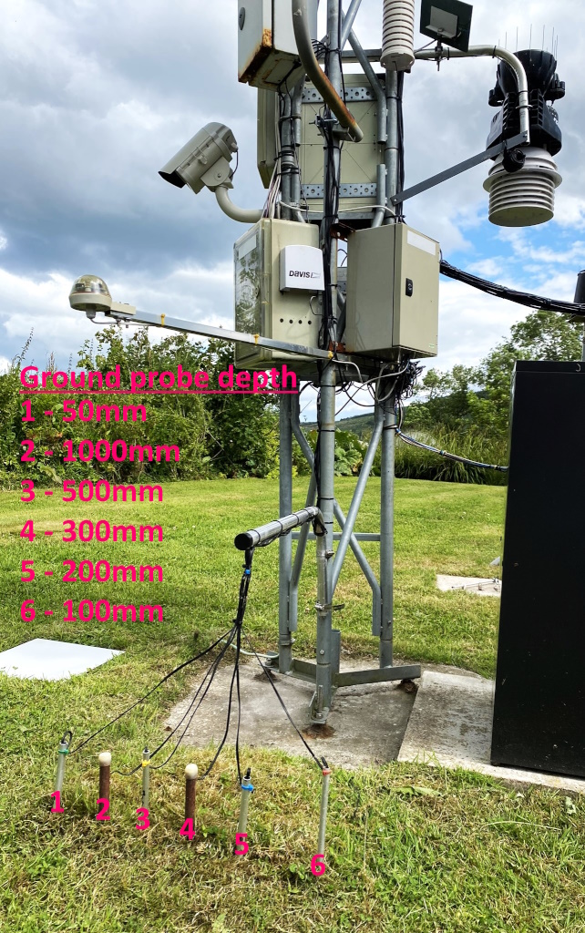 There are six ground temperature probes under a grass surface set at 50mm, 100mm, 200mm, 300mm 500mm, and 1 meter. They are attached to Elitech wifi Temperature Data Loggers and the logs are posted here at the end of every month